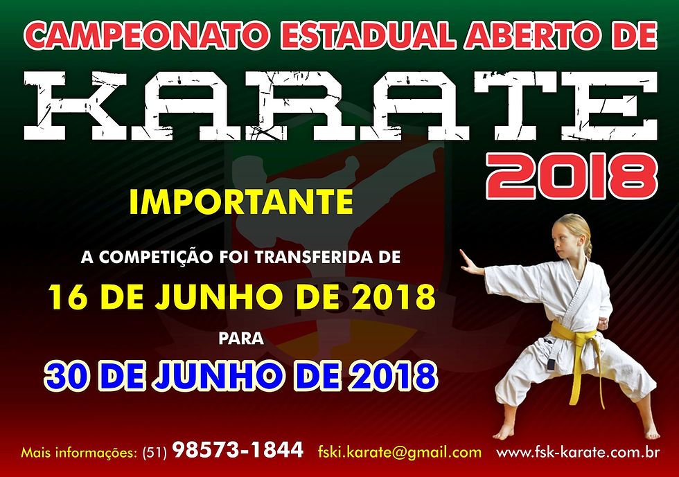 Por motivos alheios a nossa vontade, estamos modificando a data de realização do Campeonato Estadual Aberto de Karate 2018 de 16 de junho para o dia 30 de junho do ano corrente.